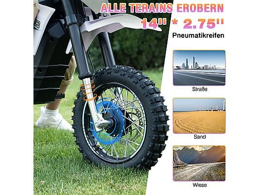 Das ElektromotorCross verfügt über 14 Zoll * 2,75 Zoll große, verschleißfeste Luftreifen für einen stärkeren Grip. Der rutschfeste Sitz mit hoher Dichte entspricht dem ergonomischen Design, ist weicher und atmungsaktiver, was ein komfortables und extremes Fahrerlebnis für Jugendliche gewährleistet.