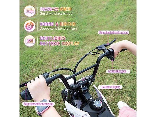 Dieses Elektromotorrad ist schwer, daher ist es wichtig, dass es von zwei Erwachsenen sorgfältig installiert wird. Überprüfen Sie vor der Fahrt, ob das Elektromotorrad korrekt montiert ist! Der Motor erzeugt eine Schallwelle, die ein Brüllen imitiert und zum Fahrspaß beiträgt.
